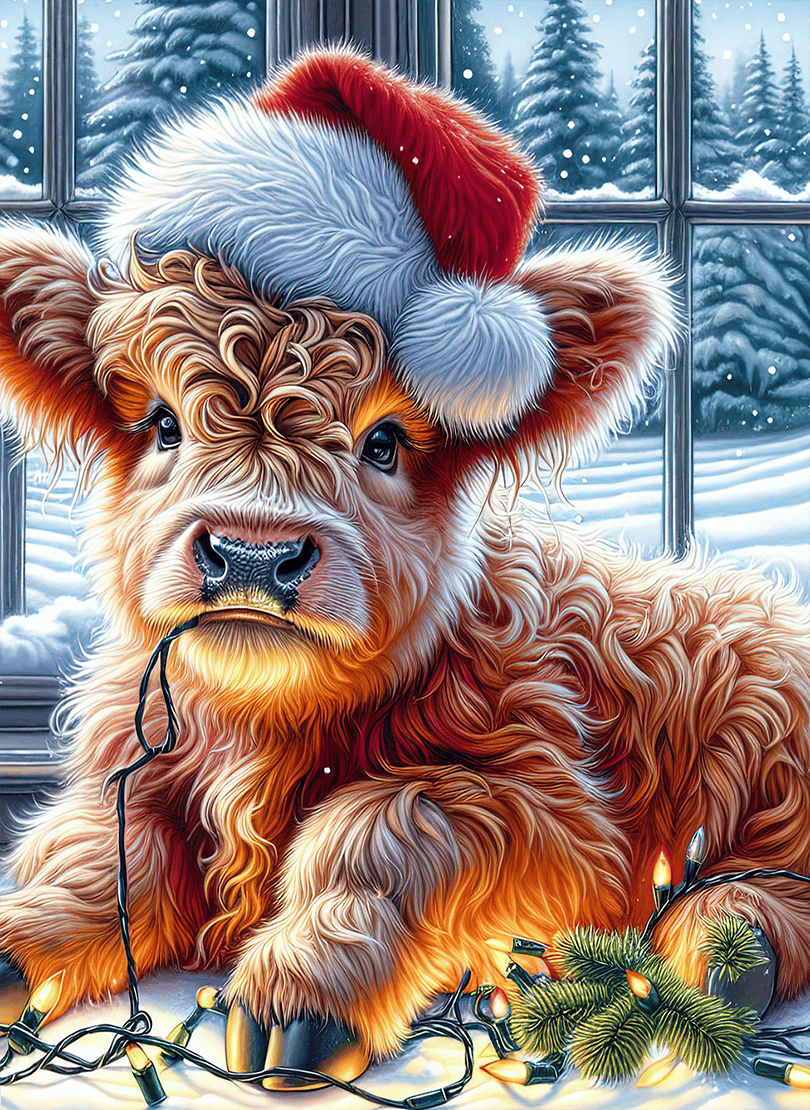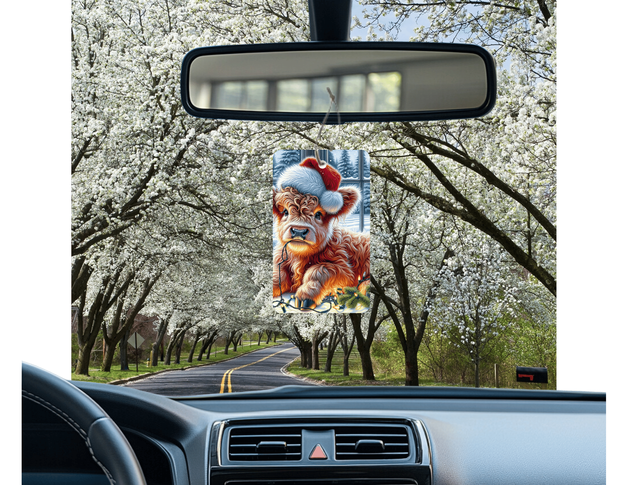 "A sweet little baby highland cow freshie, tangled up in sparkling Christmas lights, bringing a dash of holiday cheer and a whole lot of cuteness to your ride."